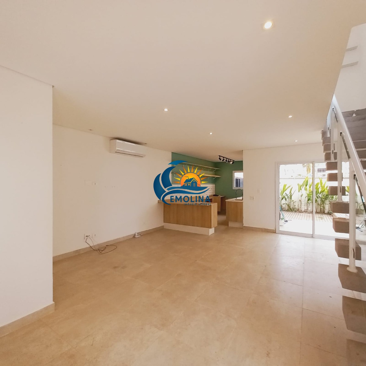 A sala é climatizada com ar condicionado, e a cozinha é integrada ao espaço de convivência.